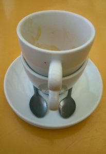 Als een commando van ’the special forces’ bereidde hij het hele scala, van de moccacino lento, de macchiato presto tot de esspresso sublimo. Zijn baas prees hem de hemel in, maar attendeerde hem erop dat hij bij het serveren een zachte glimlach diende toe te voegen om de klant in te leiden in een goddelijke koffie-ervaring. Dit bleek te veel gevraagd.