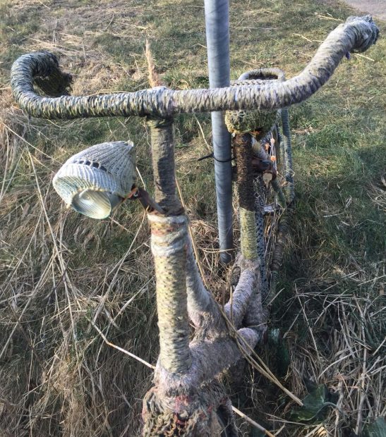 Ze zijn hier ook lief voor fietsen in de winter, ergens in de middel of now here staat er één tegen een paaltje, gelukkig ook warm ingepakt.